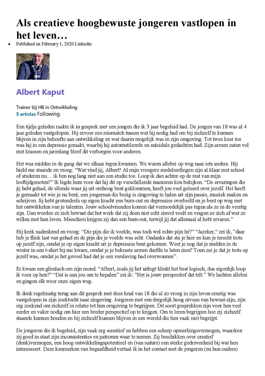 Artikel over het vastlopen van jongeren van Albert Kaput