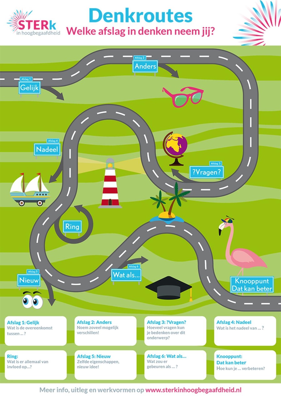 een poster met een samenvatting van vragen die analytisch en creatief denken stimuleren.